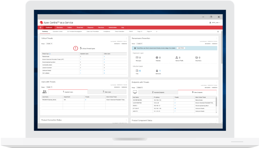 La protection Trend Micro Apex One™ assure la détection automatisée d’un large éventail de menaces (malware sans fichiers et ransomware notamment), ainsi que leur prise en charge. Nos techniques modernes et cross-générationnelles de protection contre les menaces garantissent une protection des endpoints optimale, performante et efficace.